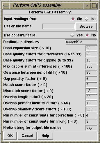 CAP3 uses forward-reverse constraints to correct errors in assembly of reads. The constraints file is generated automatically using the information in the experiment files by setting the "Use constraint file" radiobutton to "Yes". The constraints file is named after the input file with the addition of ".con" ie if the input file is called fofn, the constraint file is called fofn.con. Note that if the "Use constraint file" is set to "No", then any files of the format input_file.con will be deleted from the current directory. For further details, see section Further details about CAP3.